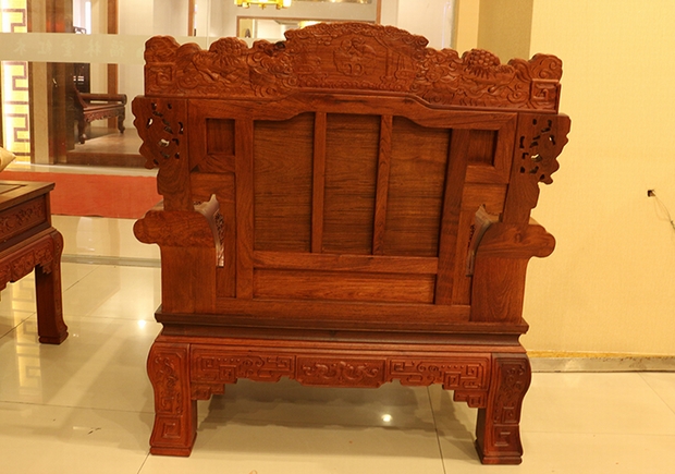 縱觀整體單人位沙發之特點,給人以一股濃濃的中國風氣息感受,沉韻而不張揚,內斂而又含蓄,雕繪出的紋樣作品中,有溫馨和美母子相依而偎幸福生活的場景畫面,有古樸而又美艷,朝氣而又靈動的自然鳥語畫卷,還有那威風凜凜憨態可掬能夠“報瑞呈祥”的送子麒麟,以及那騰空而起高高而立駕云飛舞的盤旋巨龍。無不彰顯出一股生命的活力與生氣,熱切而澎湃,身表祝福:表達其龍瑞呈祥,幸福安康之意。