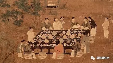 上圖是一些雅士的聚會,我們可以看到中國古代是分餐制的,大家圍到一起,在一個很大的“榻”四周。這個榻,我們仔細觀察可以發現它原本是“箱型”形制的。